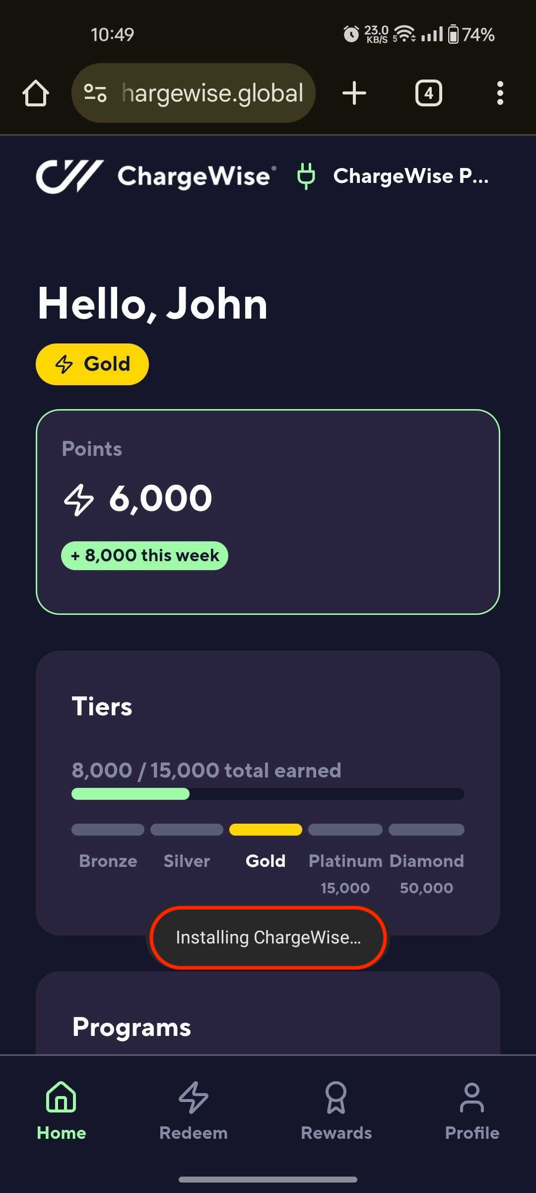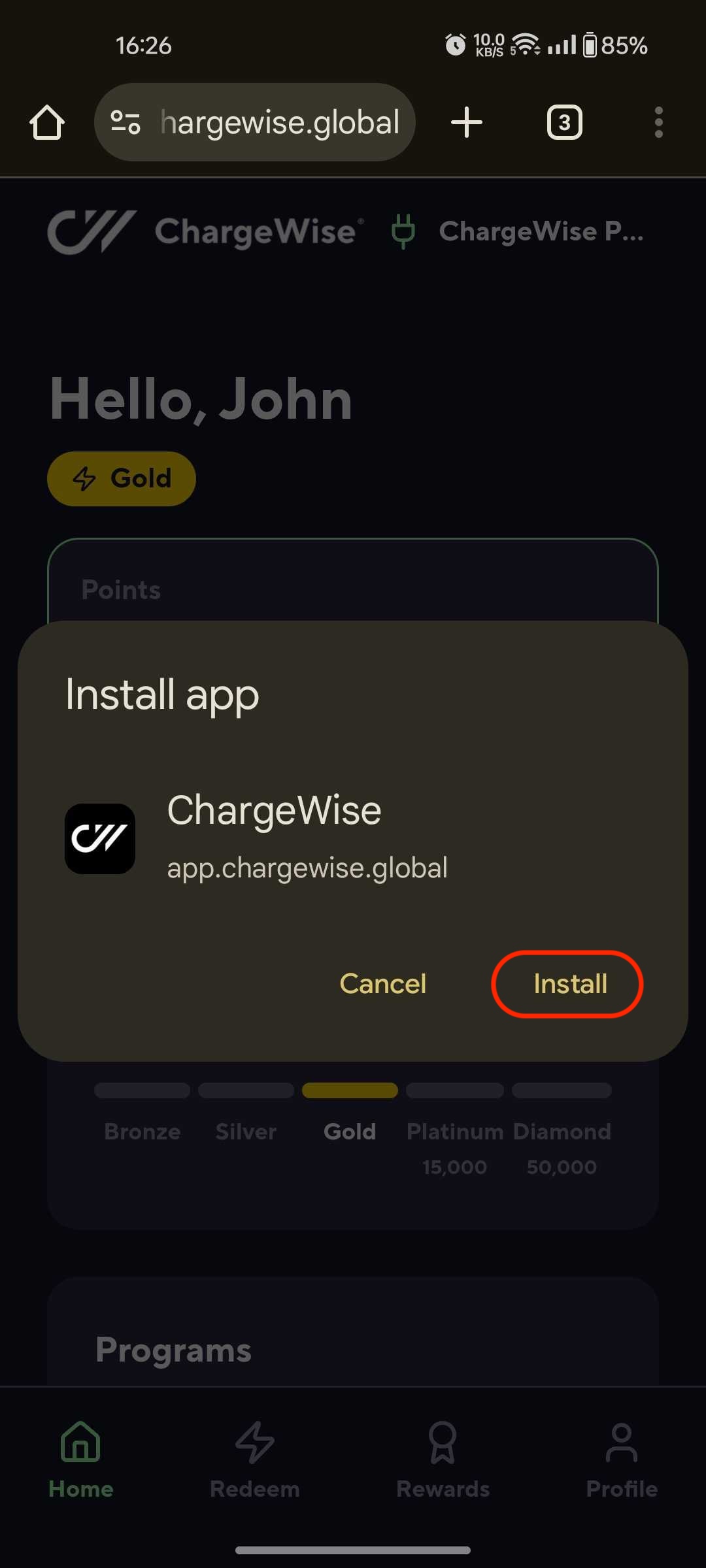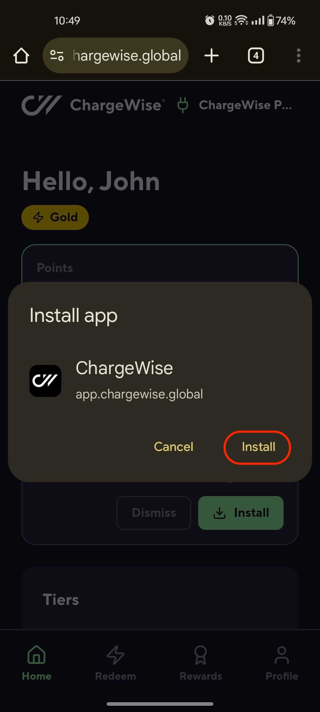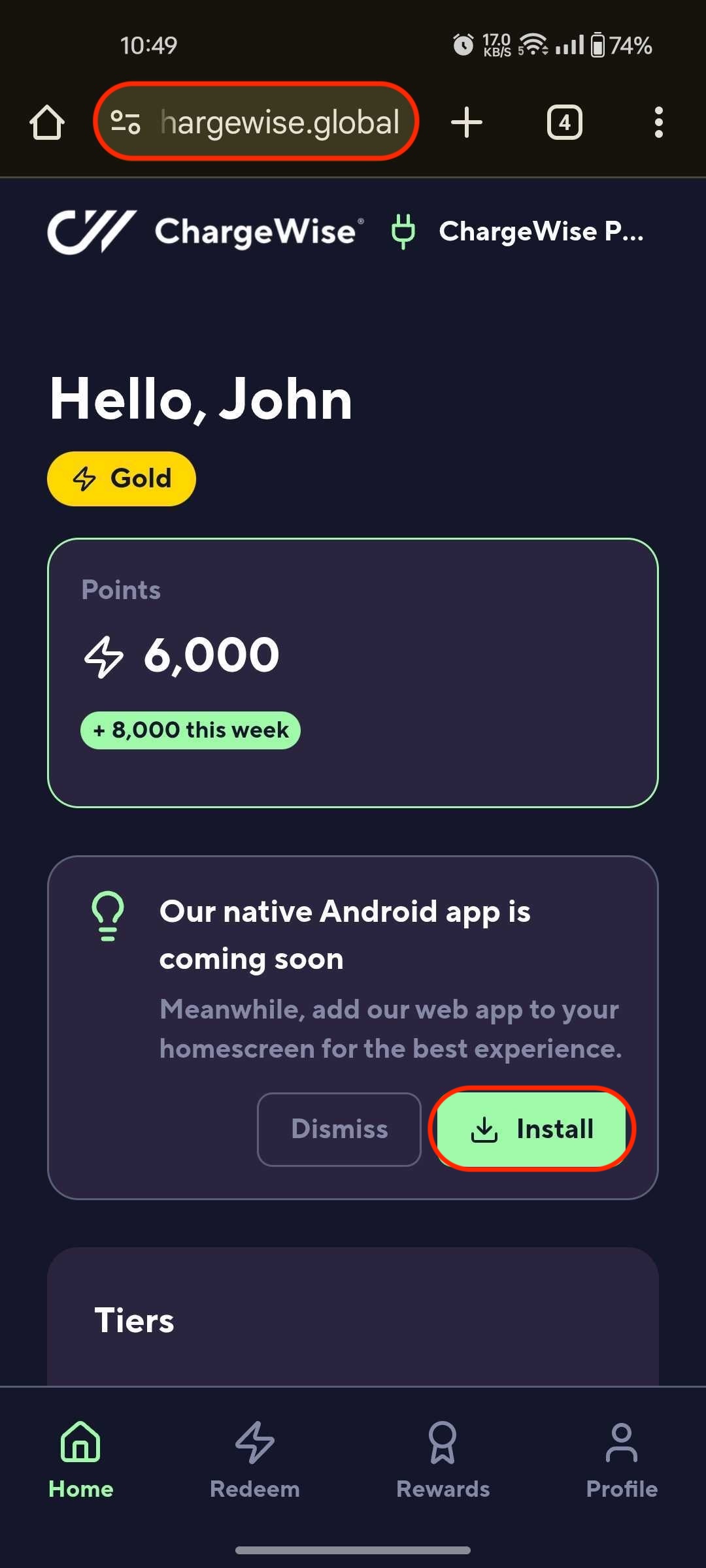 - Access https://app.chargewise.global via your mobile device > click "Install" in the "Our Native App is coming Soon" modal: