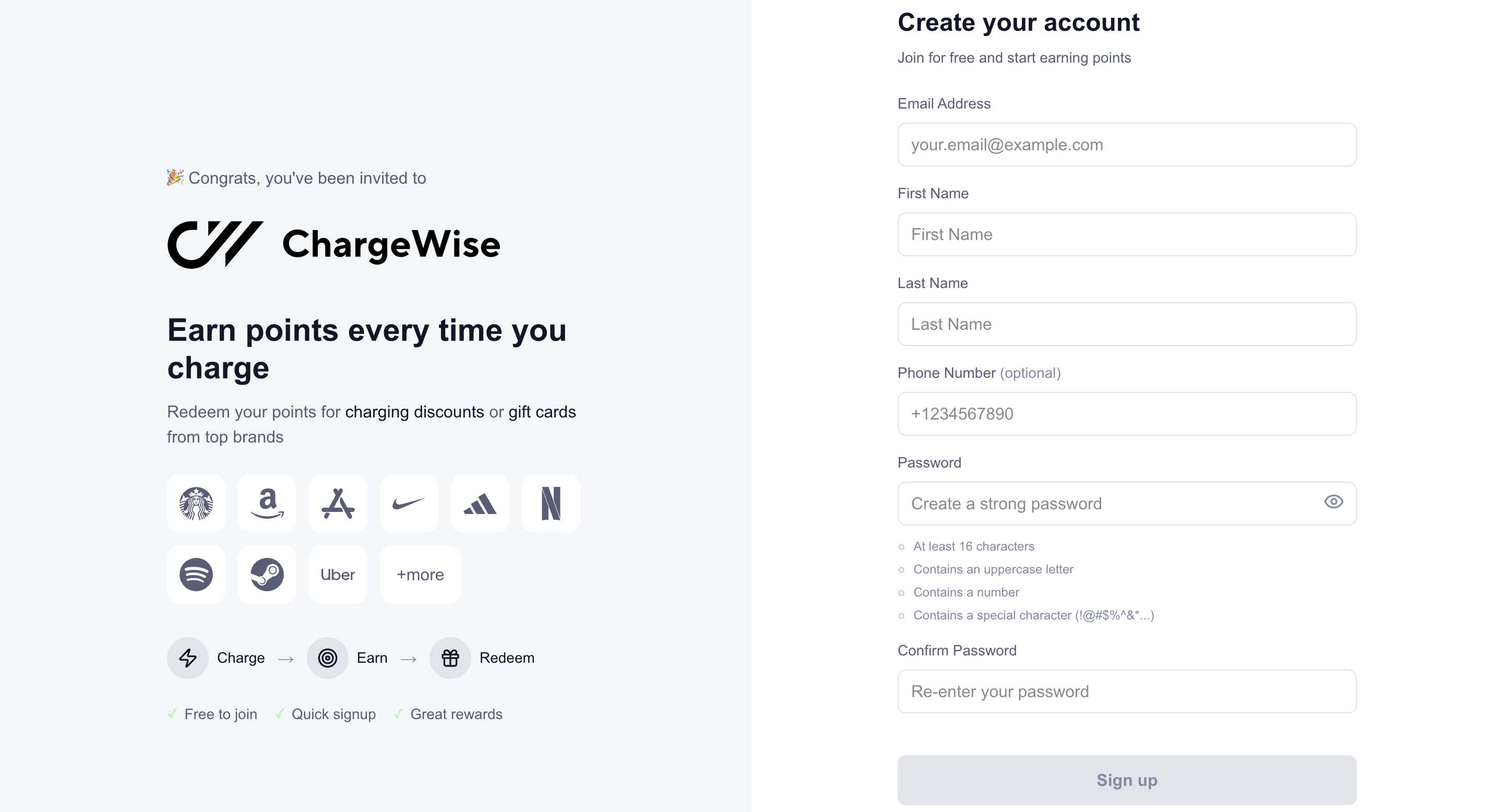 Registering a New User Account in ChargeWise is ONLY possible for users who charge their EVs on participating Charging Station Networks.