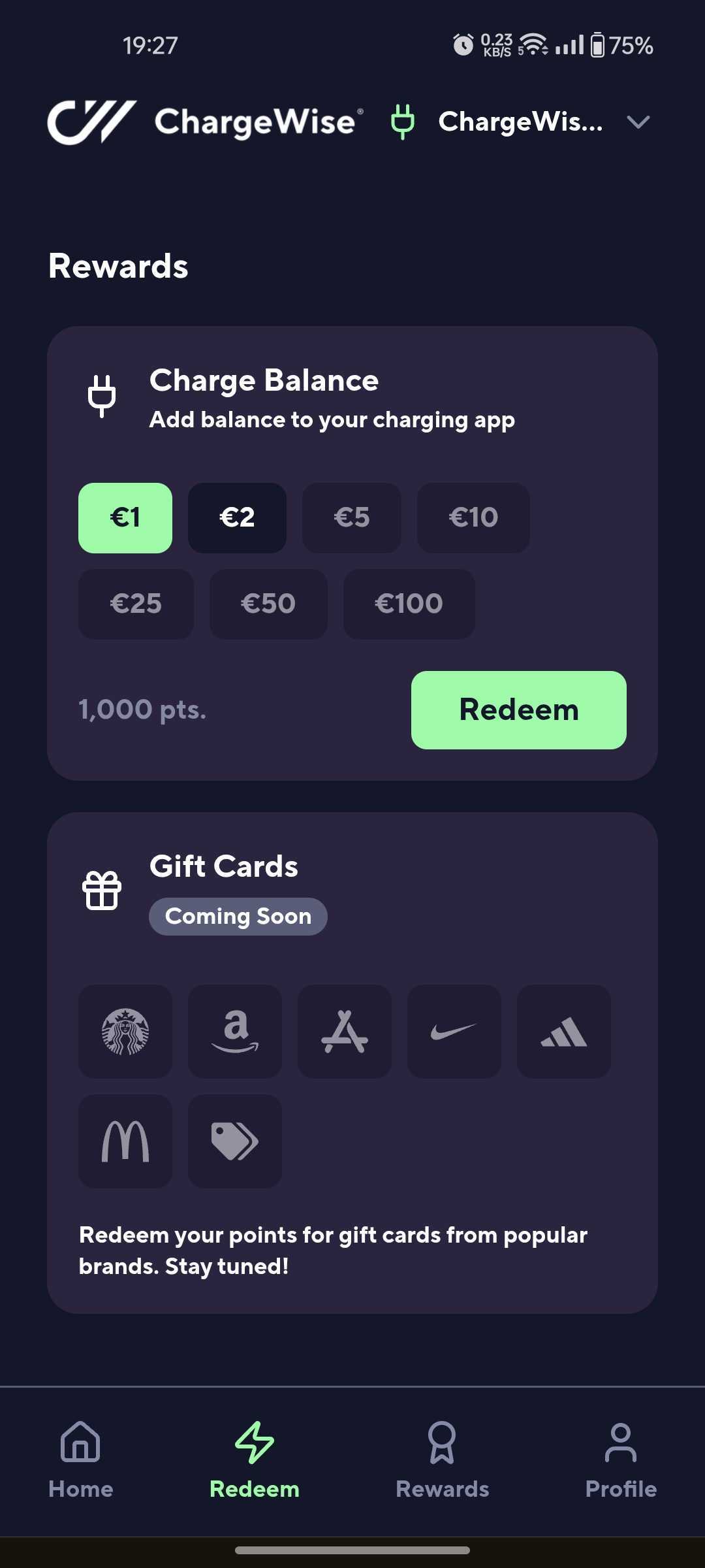 When you log in to the ChargeWise App and go to the Redeem section, you'll see all the available rewards on the screen. Here's a screenshot for reference purposes: