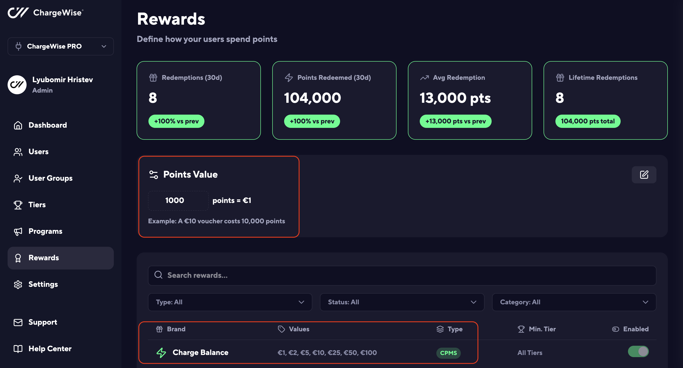 - Adding Various "Charge Balance" rewards in the admin app: