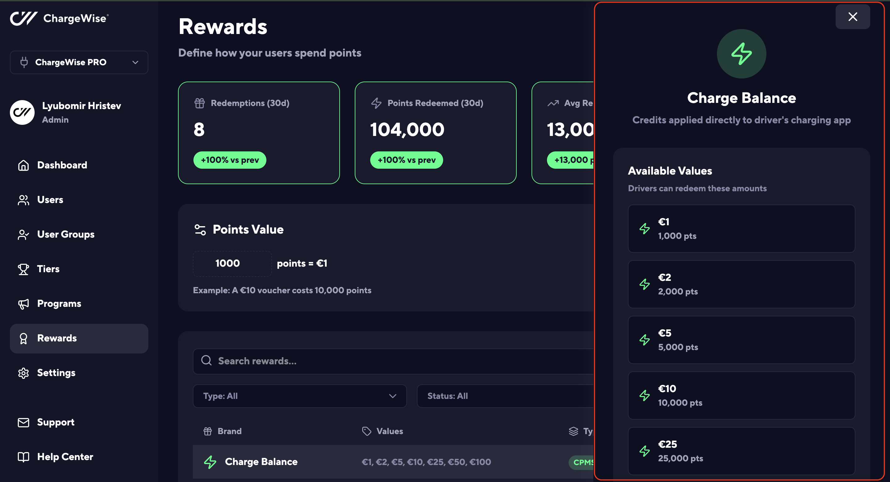Following that logic, respectively, to redeem a 2€ Charge Balance, for instance, the user will need to have gained at least 2,000 points in total. And so forth.