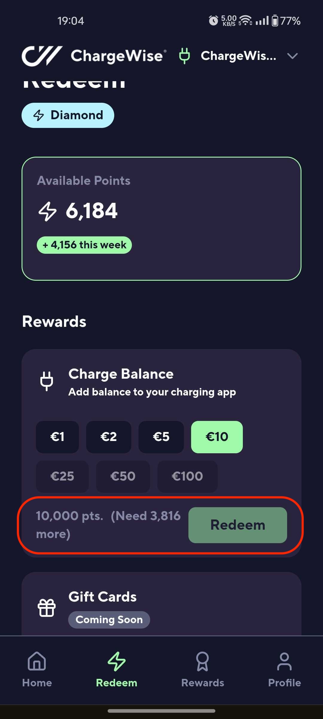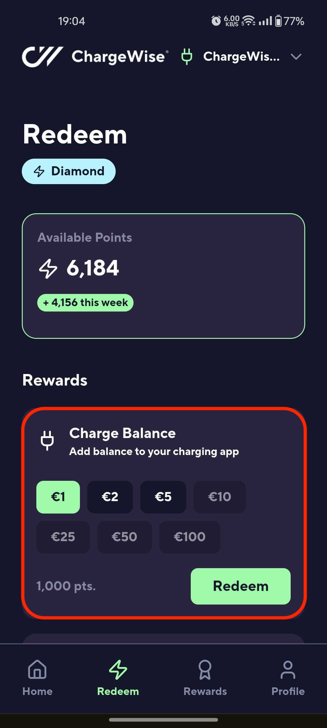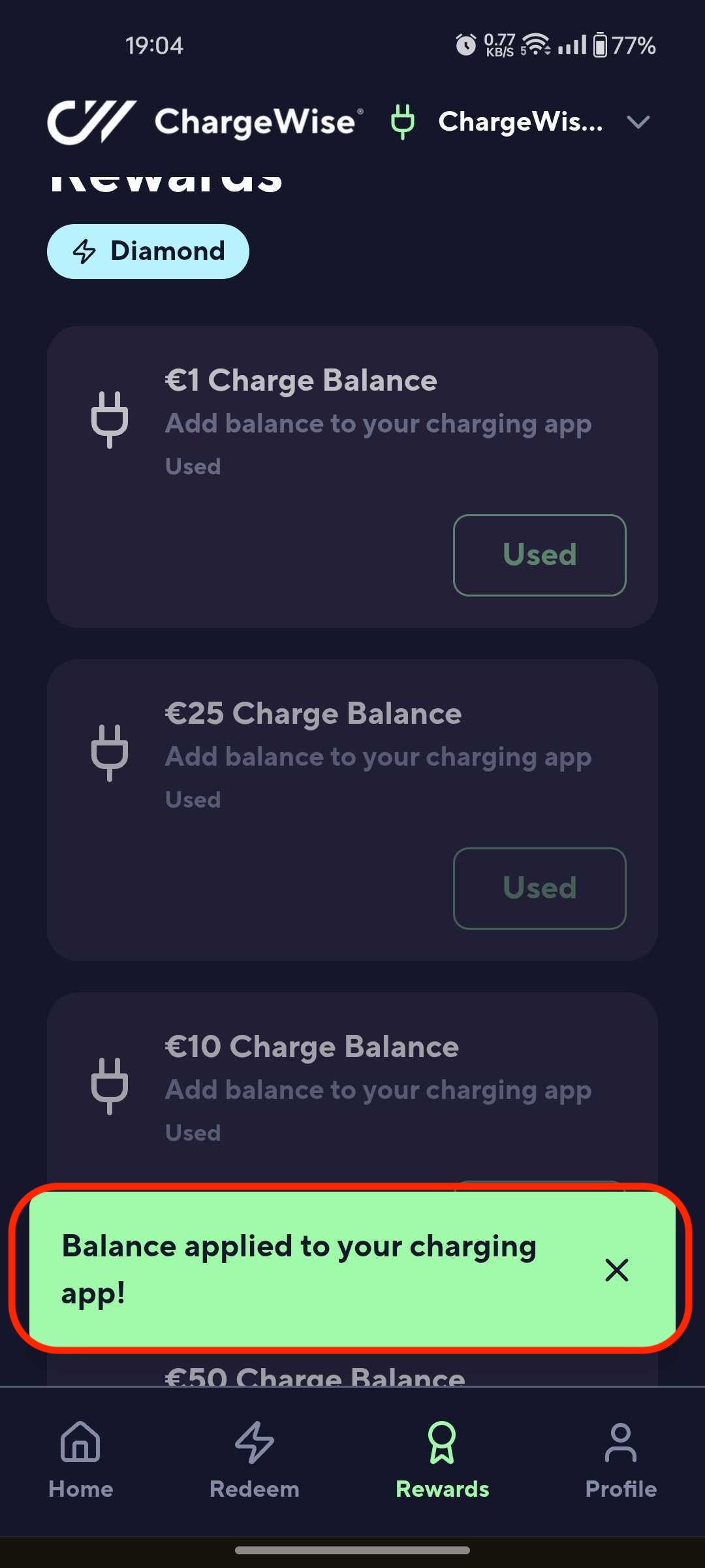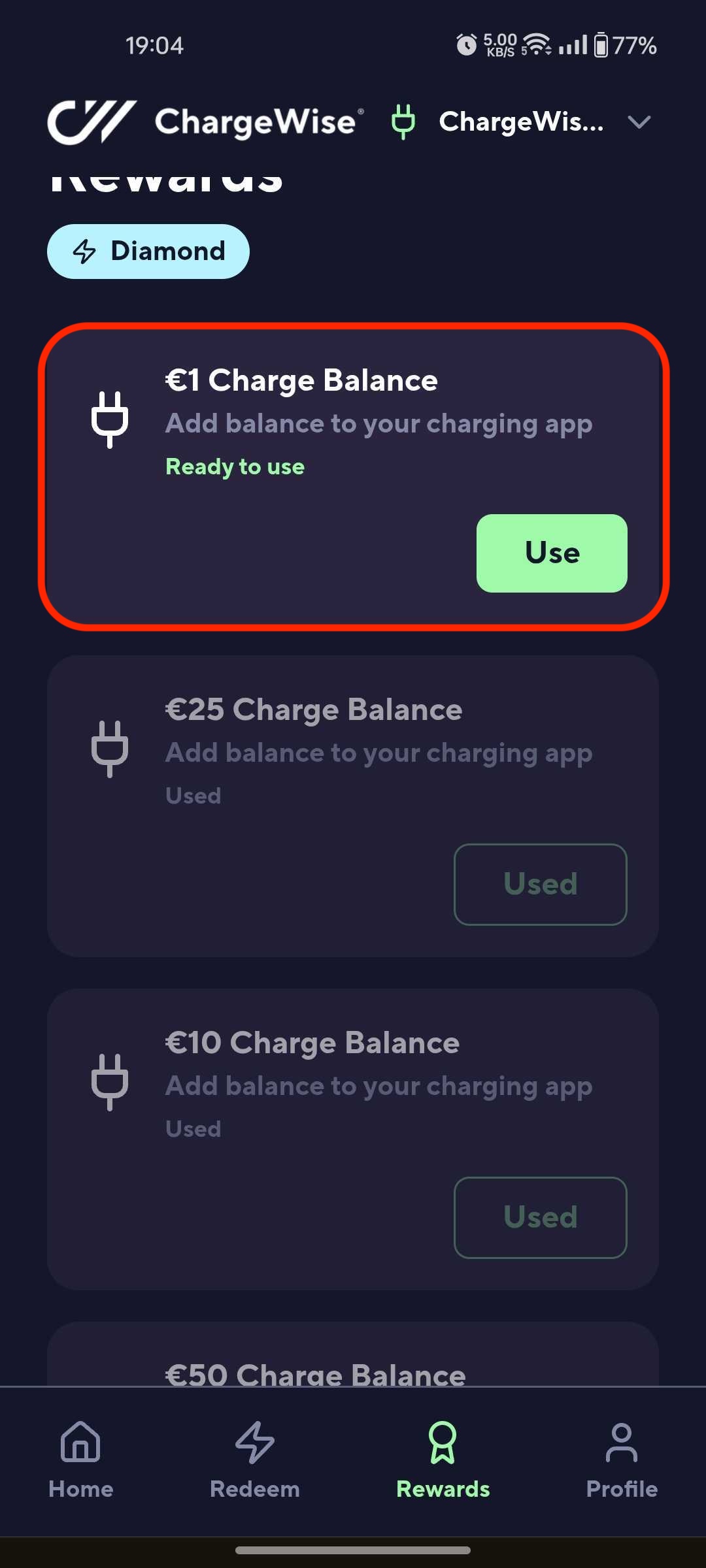 Log in to the User app > Go to Redeem > You'll see the Available Balance rewards under the "Rewards" section > Select a Charge Balance reward > Redeem